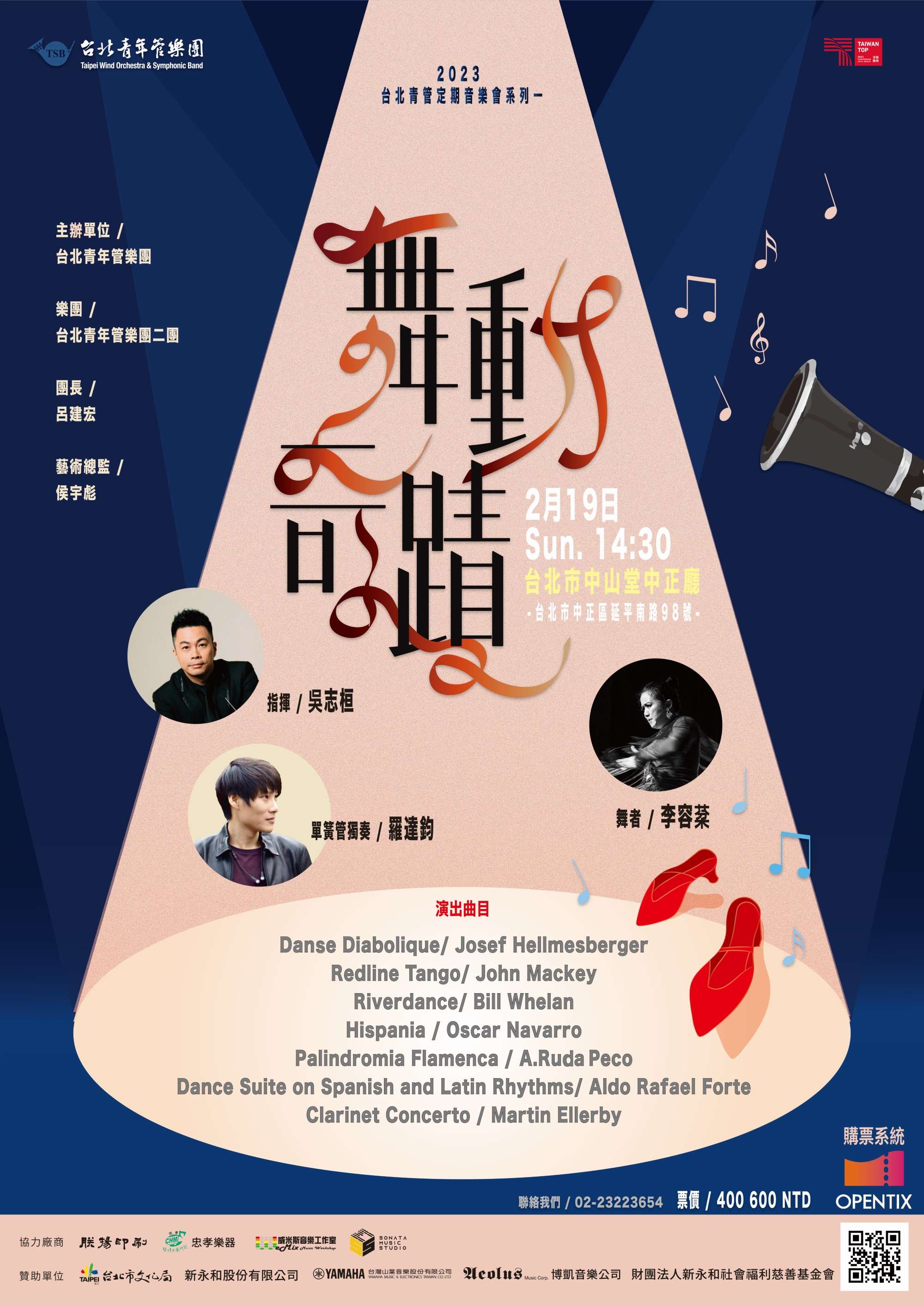一、2023台北青管定期音樂會系列一,由台北青年管樂團二團 演出、指揮吳志桓,並邀請佛朗明哥舞者李容棻同台演 出,單簧管獨奏家羅達鈞演出協奏曲,帶來一連串好聽悅 耳的舞曲,不可錯過。 二、旨揭音樂會相關訊息如下: (一)演出時間:112年2月19 日 (星期日)下午2:30 。(二)演出地點:臺北市中山堂中 正廳(臺北市延平南路98號)。 (三)購票與折扣優惠查詢 請至兩廳院購票系統 (https://0rz.tw/oc4At);相關問題 請逕洽台北青管樂團經理王先生(02-2322-3654)。 (四)相 關音樂會資訊請至台北青年管樂團臉書粉絲專頁查詢 (https://www.facebook.com/tsbgroup/)。 三、檢附旨揭音樂會海報供參。