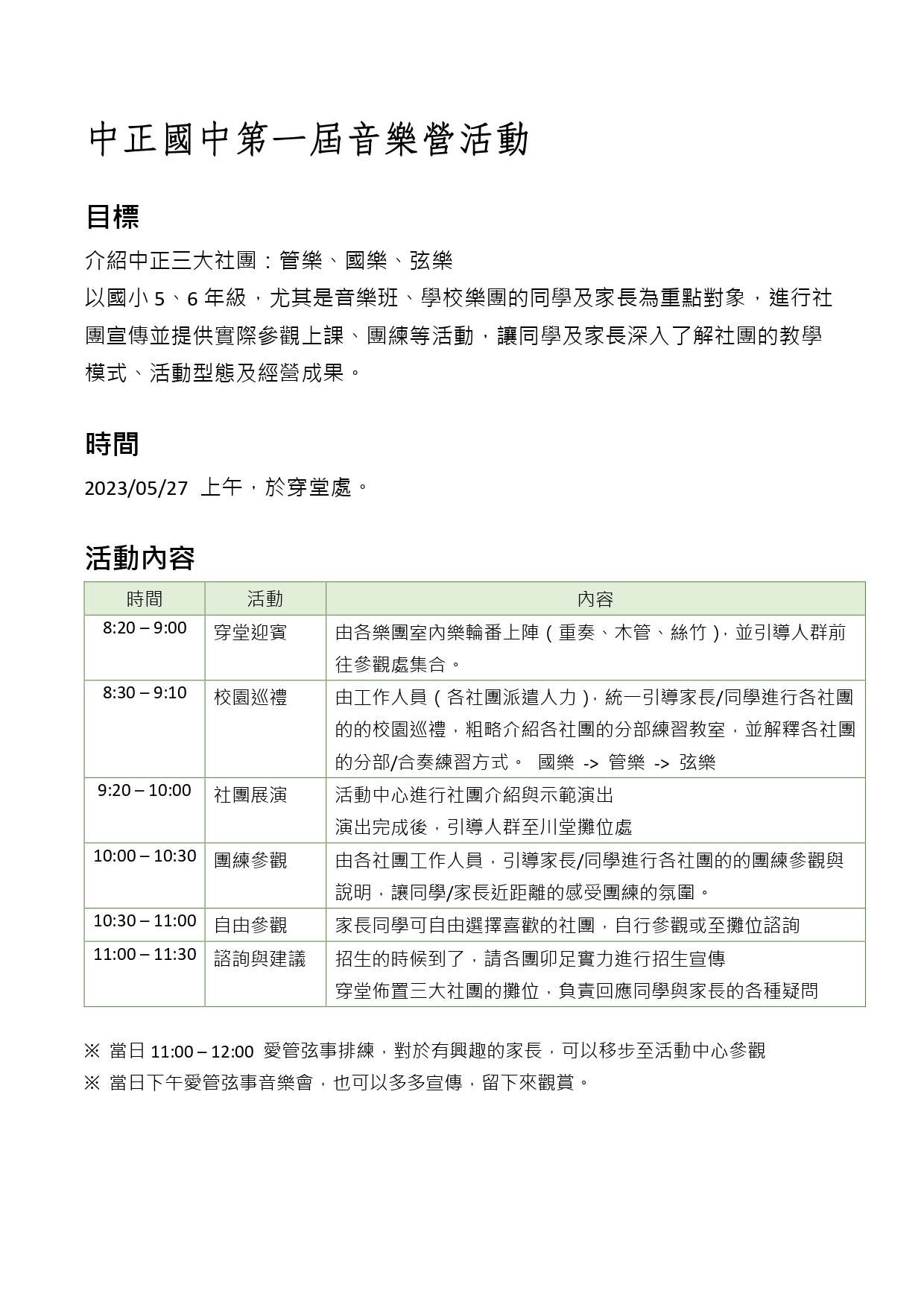 一、活動目標:宣傳本校弦樂、國樂及管樂特色。