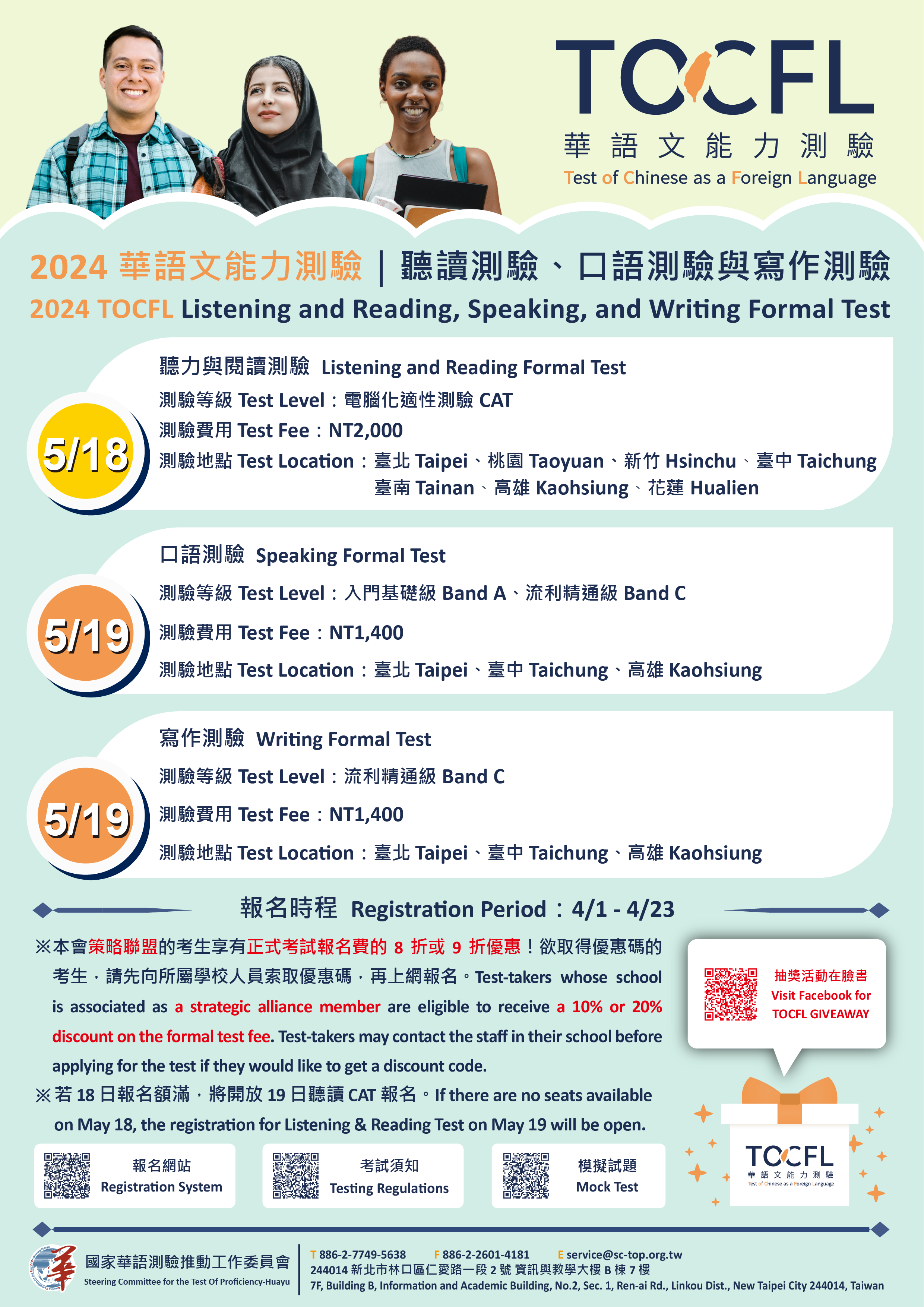 七、抽獎活動:凡報考口語或寫作測驗並完成繳費者,可參加 華測FB粉絲專頁抽獎活動。詳情請見粉絲專頁貼文: https://www.facebook.com/SCTOP.TOCFL。