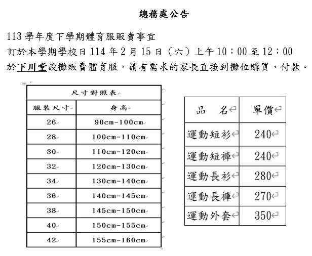 113學年度下學期體育服販賣事宜訂於本學期學校日114年2月15日(六)上午10:00至12:00於下川堂空間設攤販賣體育服,請有需求的家長直接到攤位購買、付款。