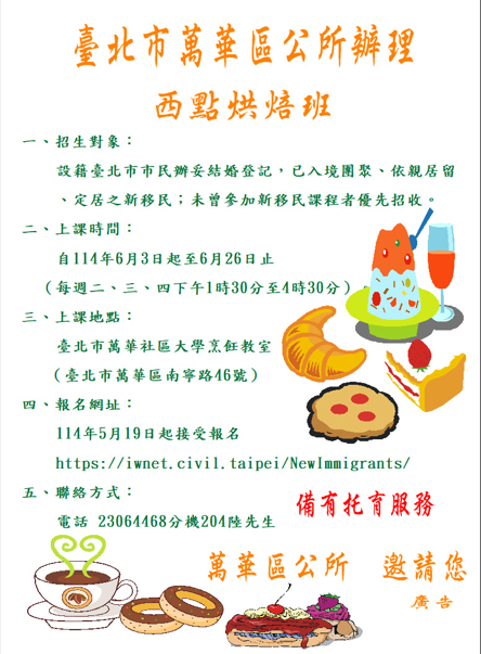 臺北市萬華區公所將於114年6月3日起至 6月26日止(每週二、三、四)1時30分至4時30分,假臺北 市臺北市萬華社區大學(臺北市萬華區南寧路46號)烹飪 教室,開辦新住民西點烘焙班歡迎報名參加,報名網址: https://iwnet.civil.taipei/NewImmigrants/詳情請參閱 萬華區公所網站或電洽(02)2306-4468轉204陸先生