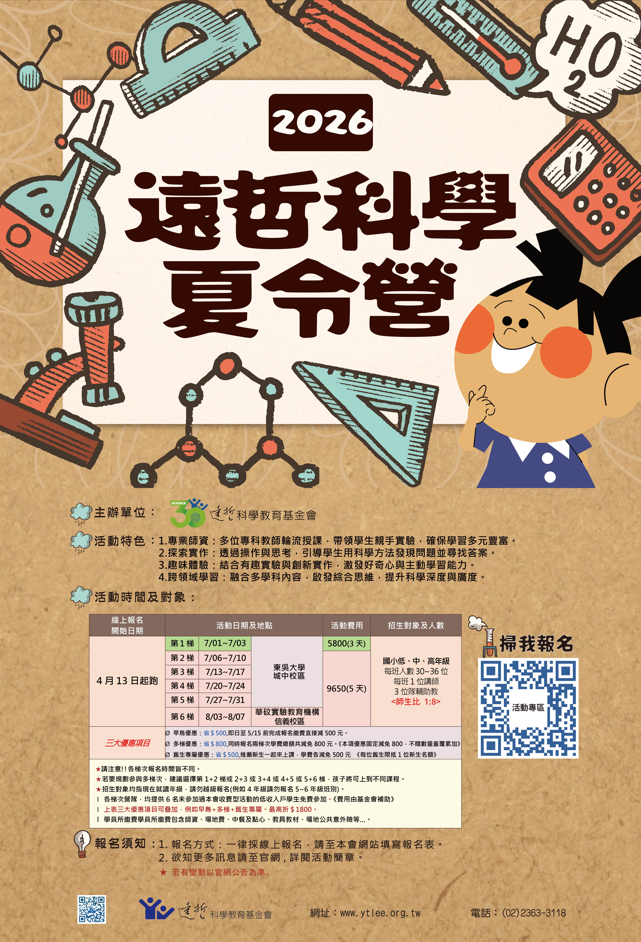 一、活動宗旨: 為推廣科學與數學素養教育,啟發學生創造力 與邏輯思考能力,本會擬於 2026 年暑期舉辦旨揭活動, 透過手作與實驗體驗科學趣。