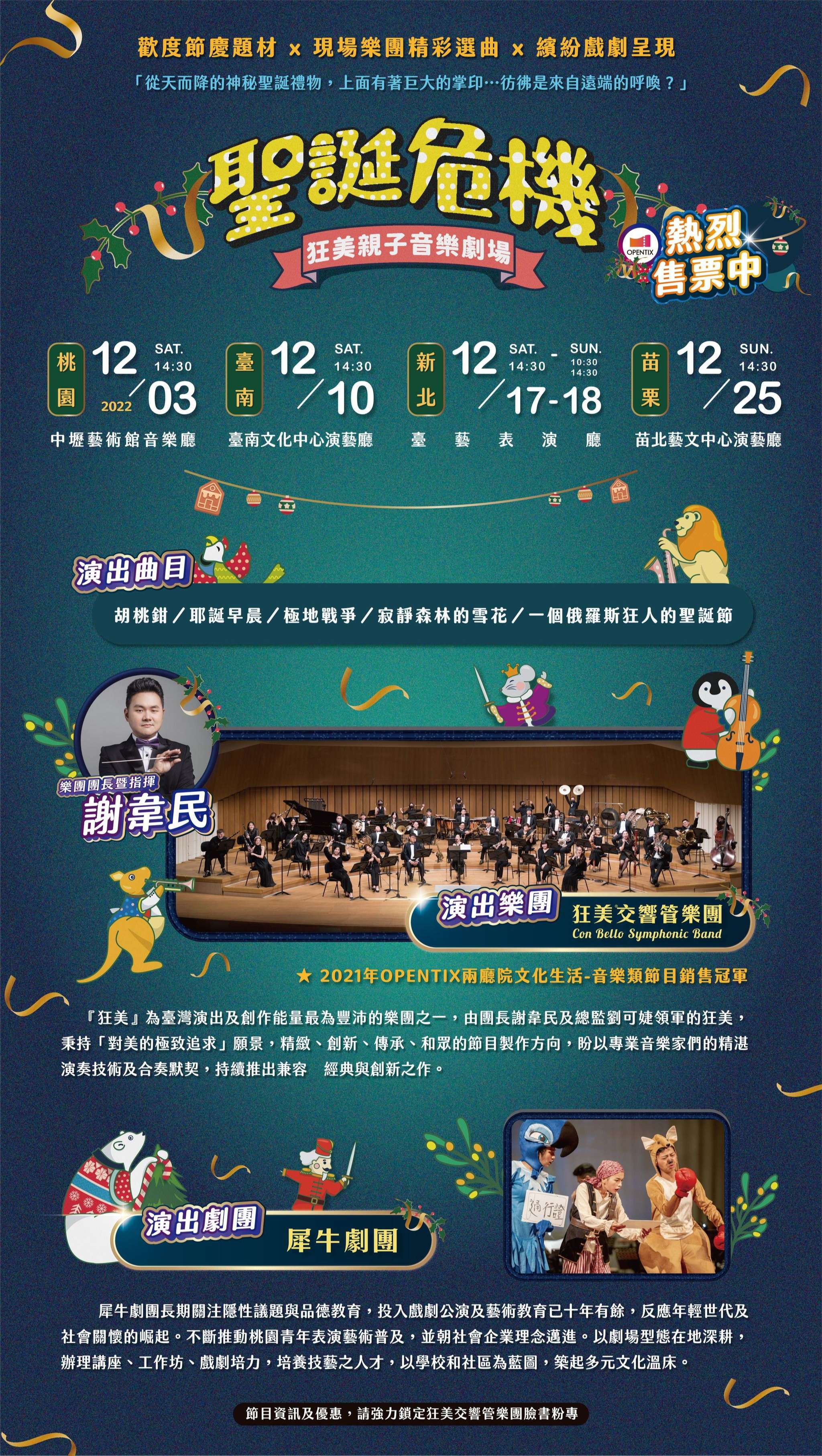 一、節目介紹:狂美交響管樂團自2017年起,致力打造以「管 樂」為基底,跨界呈現的【狂美親子音樂劇場】,所推出 之精彩節目,廣受觀眾好評。本次將再度與犀牛劇團為孩 子打造〝節慶感〞新作《聖誕危機》,一起探討大自然環 境共存議題,盼在溫馨的聖誕佳節前夕,給孩子與父母們 擁有一場溫馨美好的看戲時光。 二、演出日期及地點: (一)2022年12月03日 中壢藝術館音樂廳 (二)2022年12月10日 臺南文化中心演藝廳 (三)2022年12月17-18日 臺藝表演廳 (四)2022年12月25日 苗北藝文中心 三、免費加入愛樂之友即可取得購票優惠: https://line.me/R/ti/p/%40conbello2017 四、旨揭展演活動票價為新台幣300至1500元,購票請洽 OPENTIX兩廳院文化生活購票系統: https://s.opentix. life/p/P46fec3cd 五、活動相關資訊請洽樂團臉書粉絲專頁: https://www. facebook.com/ConBello2017/