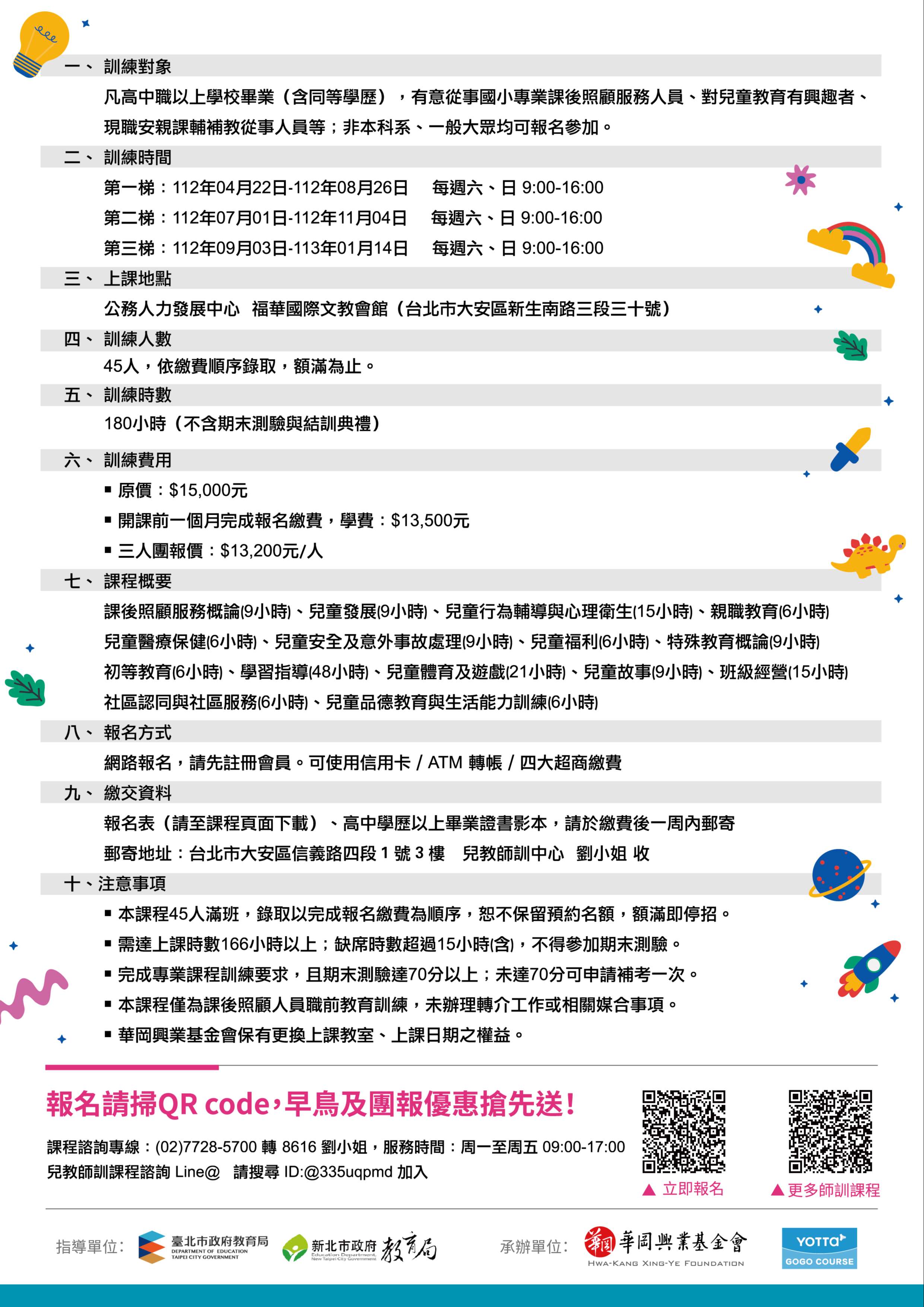 (三)課程時段:每週六、日 上午9:00~12:00及13:00~16:00