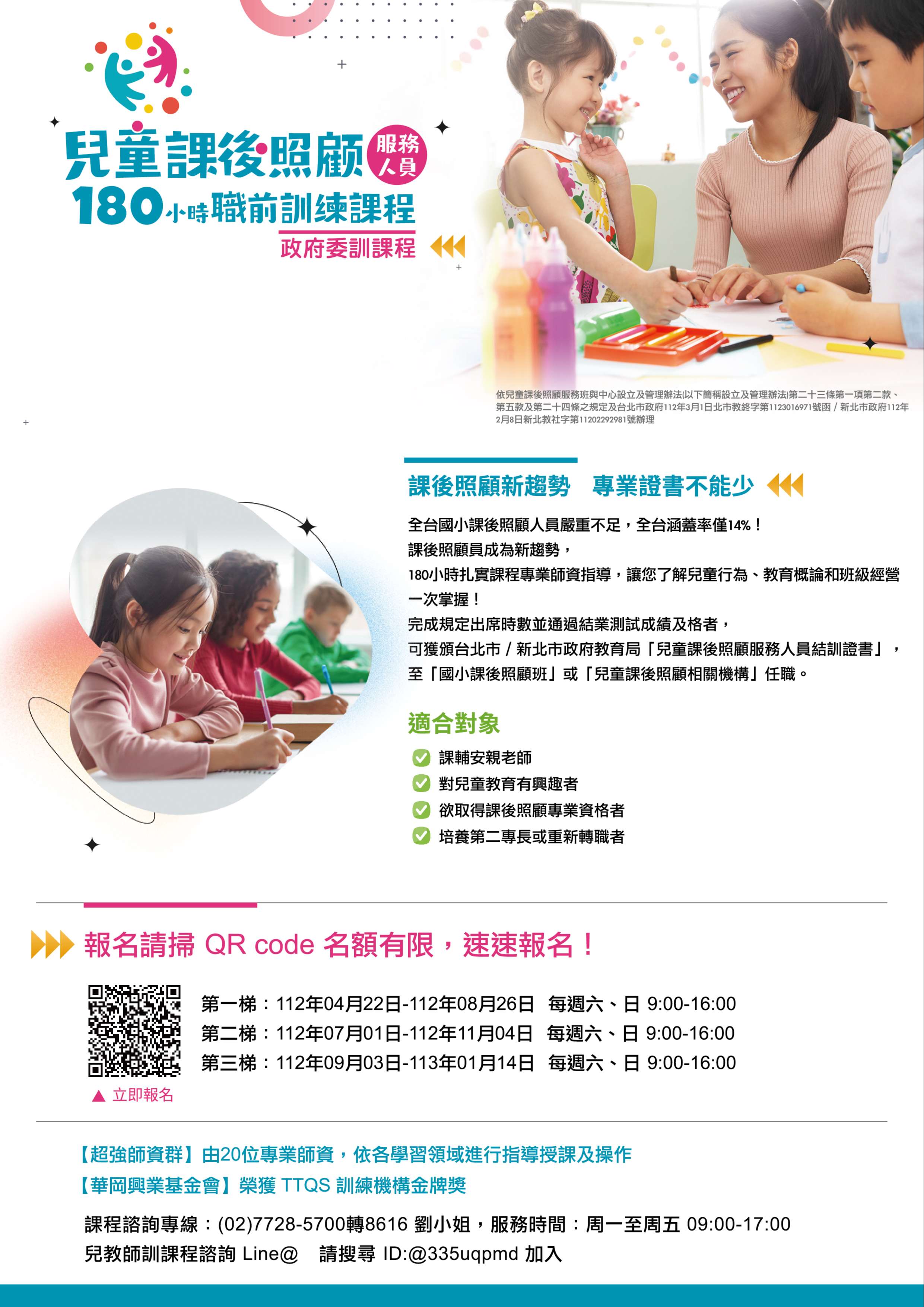 (一)招生對象:凡高中職(含)以上學校畢業,有意從事國小專業課後照顧服務人員並對兒童教育有興趣者或現職安親課輔補教從業人員均可報名參加,依報名繳費順序錄取,額滿為止。凡符合「兒童課後照顧服務班與中心設立及管理辦法」第23條任一資格者,毋須報名此課程。