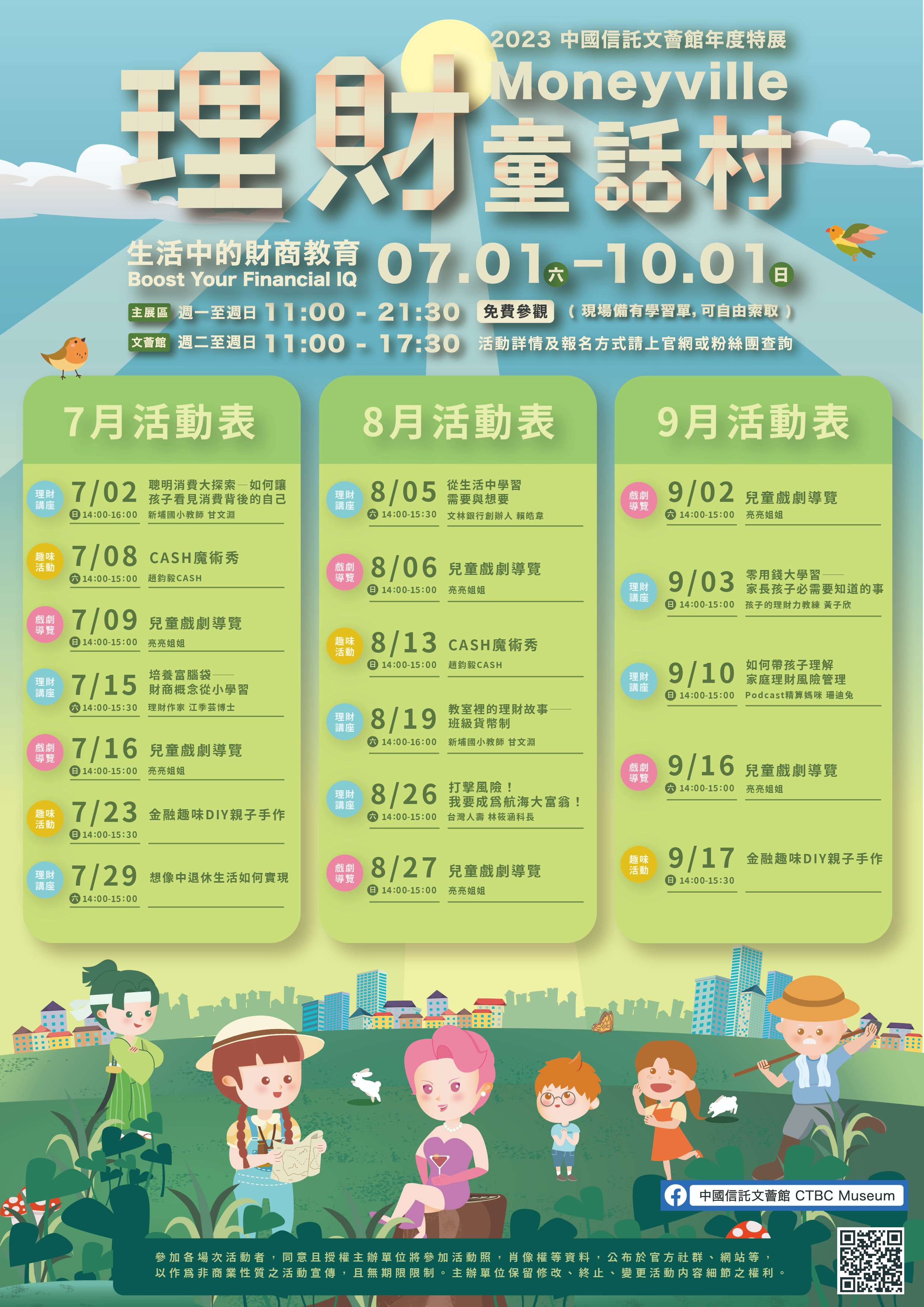 (三)特展簡介:打造繪本故事風格的展場,探討生活中可能會遇到的金融問題及應該如何因應。展區依「存款與緊急預備金、錢從哪裡來?認識金融機構」、「目標儲蓄與消費、需要與想要、記帳」、「支付方式、投資理財與風險」、「比價節流、借貸、斜槓開源」、「生活中必要的保險」等五個主題,切入貼近生活的財商觀念,以簡單有趣互動探索及闖關學習單,引導思考學習財商小常識、理財觀念。凡於特展期間完成指定任務者,不只可獲得限定精美小禮,還有機會抽中Switch大獎。